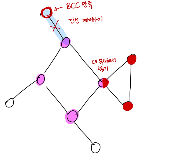 위 그림처럼 cv를 먼저 찾고 간선을 포함하지 않거나(하나의 정점은 BCC이다) cv를 복사해서 넣는다